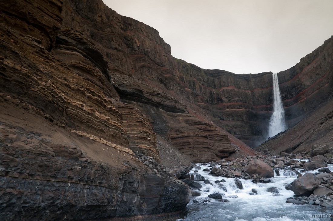 Samotný vodopád je krasavec. Tmavé čedičové vrstvy jsou proloženy sytě rudými žílami, přes které padá bělostný závoj ledovcové řeky.