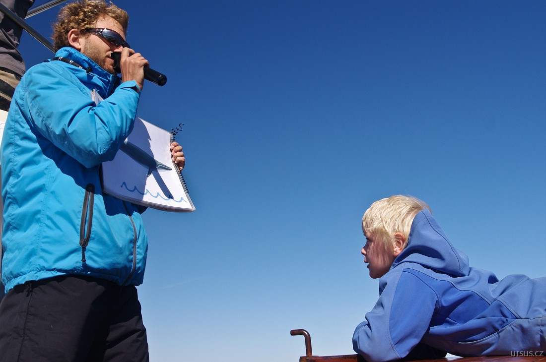 Po chvíli se z velitelského můstku ozývá: "plejtvák obrovský na 9 hodině"...