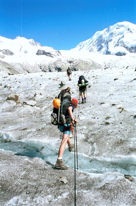 První setkání s ledovcem Gornergletscher. Vpravo před námi Lyskamm (4527m)