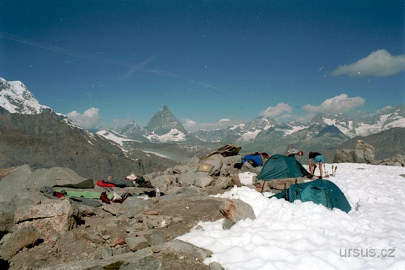 Ráno před balením věcí na aklimatizační výstup. V pozadí Matterhorn