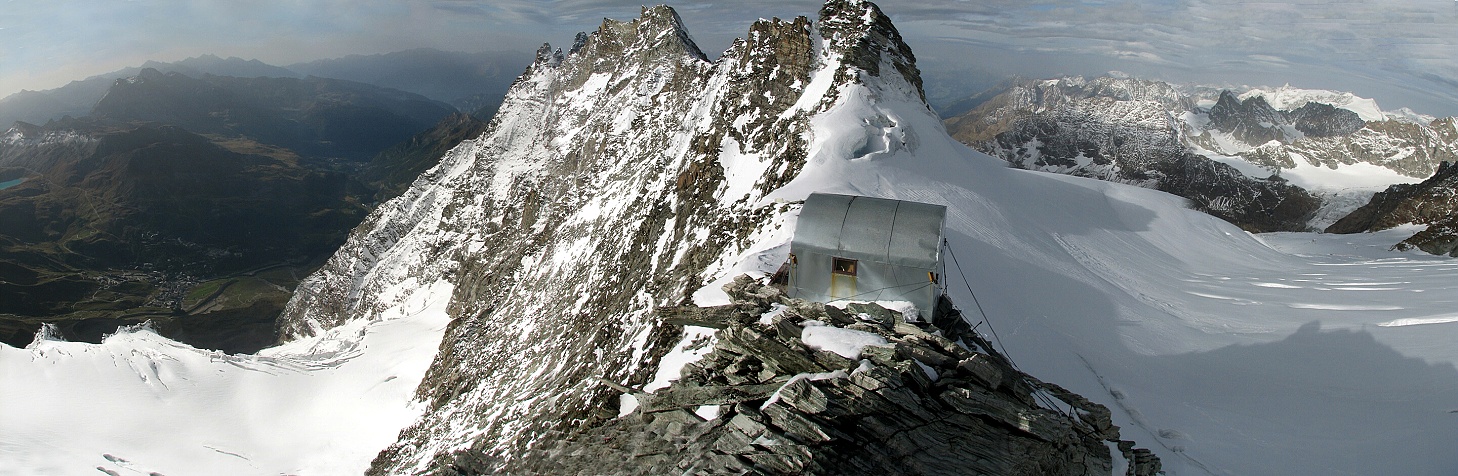 Bivak Perelli (3831m). Vlevo dole vesnice Cervinia