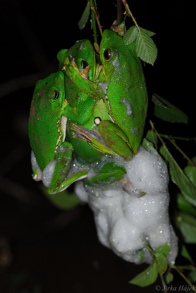 Jako třeba tenhle "trs" létavek (rod Rhacophorus). Pěna pod nimi je vytvořena jimi vyprodukovaným sekretem, a do této pěny "kladou" samice vajíčka, které se pak uvnitř vyvíjejí.