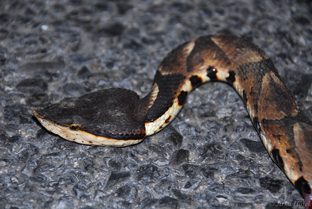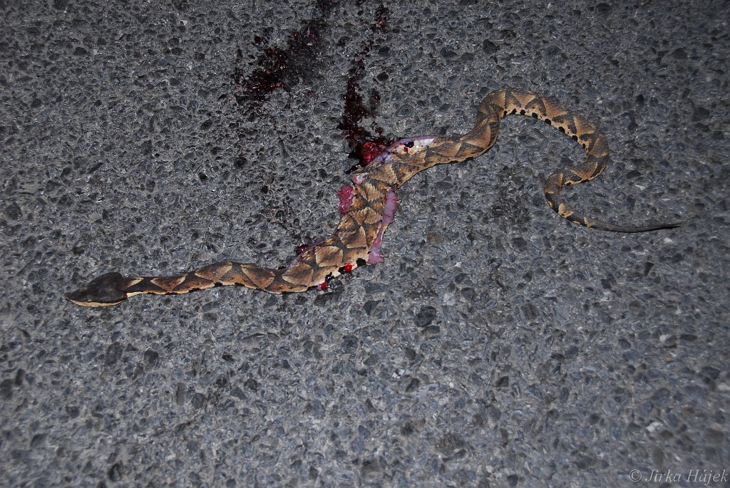 Tentokrát "naštěstí" jen rozjetého (i když se ještě hýbal)...Jo zapoměl bych napsat o co jde. Je to ploskolebec nosorohý (Deinagkistrodon acutus), jeden z nejjedovatějších hadů Číny. Číňani o něm říkají, že když člověka uštkne, ujde dotyčný pět kroků a game is over. Asi trochu přeháňka, ale daleko od pravdy možná taky nebudou. Neradno pokoušet:)