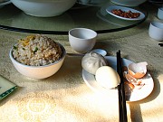 A bohužel taky standardní snídaně. Vajico, kynutý knedlík plněný ničím nebo trochou masa se zelím a k tomu rýže pro změnu s vajicem...