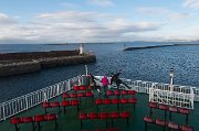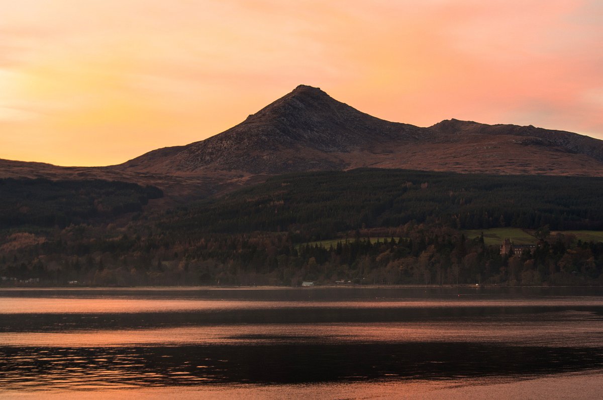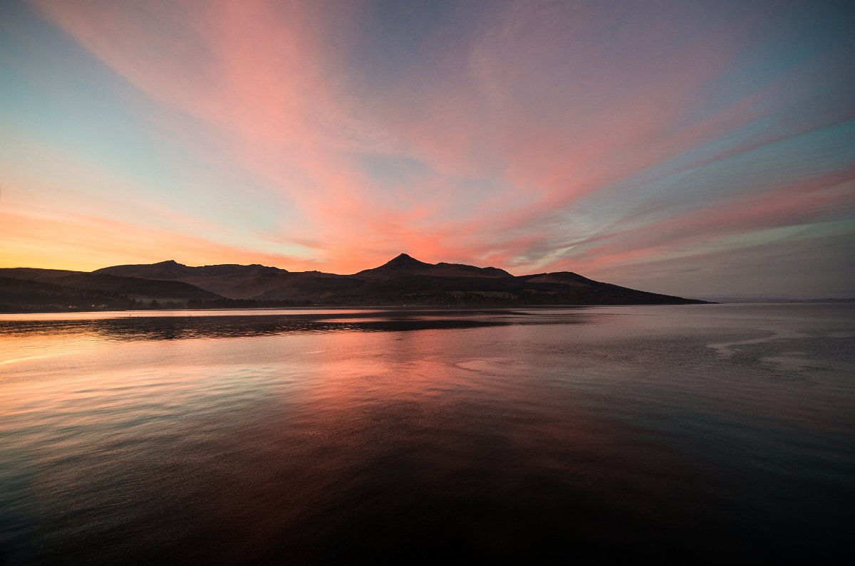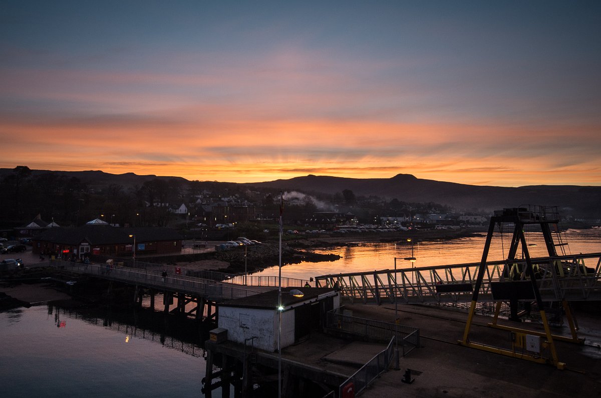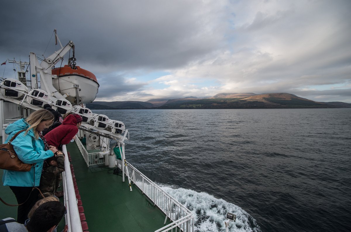 V Brodicku už na nás čeká trajekt společnosti Caledonian MacBrayne, který nás zaveze zpět na pevninu. Při nalodění se nebe rozzáří nádherným západem Slunce. Jako by se s námi chtěl ostrov důstojně rozloučit. Goatfell a Brodick Castle v růži západu. Příroda je opravdu nejlepší malíř!