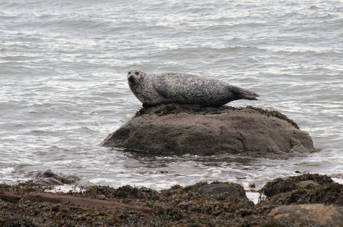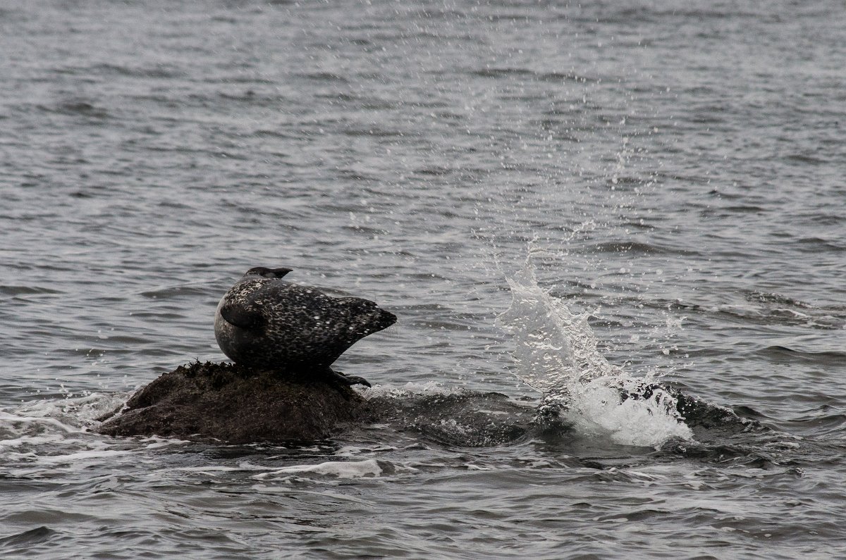 Kousek odtud - na poli v údolí Glen Rosa pod horou Goatfell, stojí několik menhirů a kamenných kruhů. A nejsou poslední, které na naší cestě vidíme... Černobílá varianta typického skotského plemena skotu aneb Highlandky. Při jízdě vesničkou Corrie obdivujeme umělecky zpracované kovové sochy tuleňů na mořském pobřeží. O kousek dál se na kameni povaluje živý tuleň. Vypadá úplně stejně, jako ta socha, jenže je živý. Je mi trošku záhadou, jak se tento nemotora dostal na tak vysoký kámen přímo z moře. Oni jsou vlastně ti tuleni tři. Ale jen dva okupují svůj "ostrůvek", zatímco ten třetí se snaží je shodit do moře a ostrůvek zabrat pro sebe.