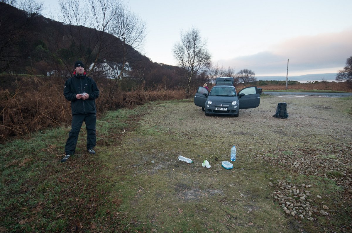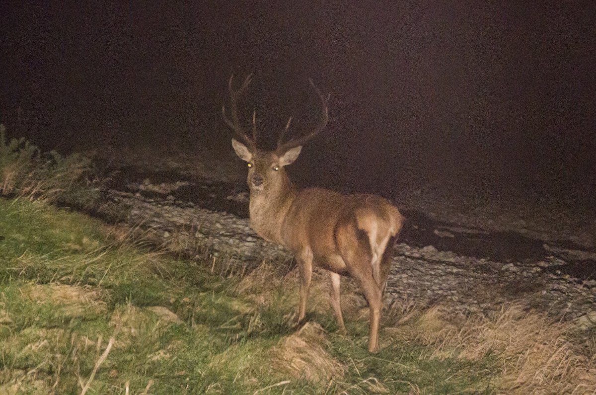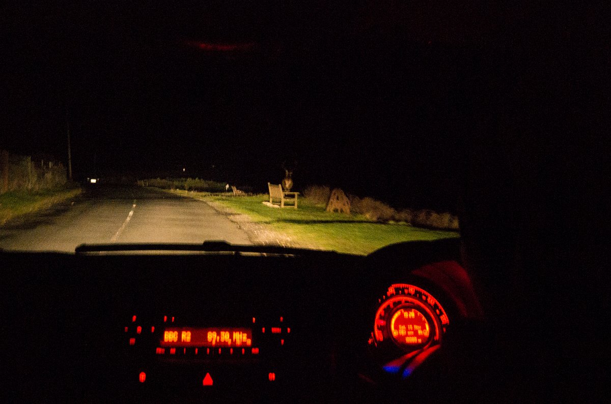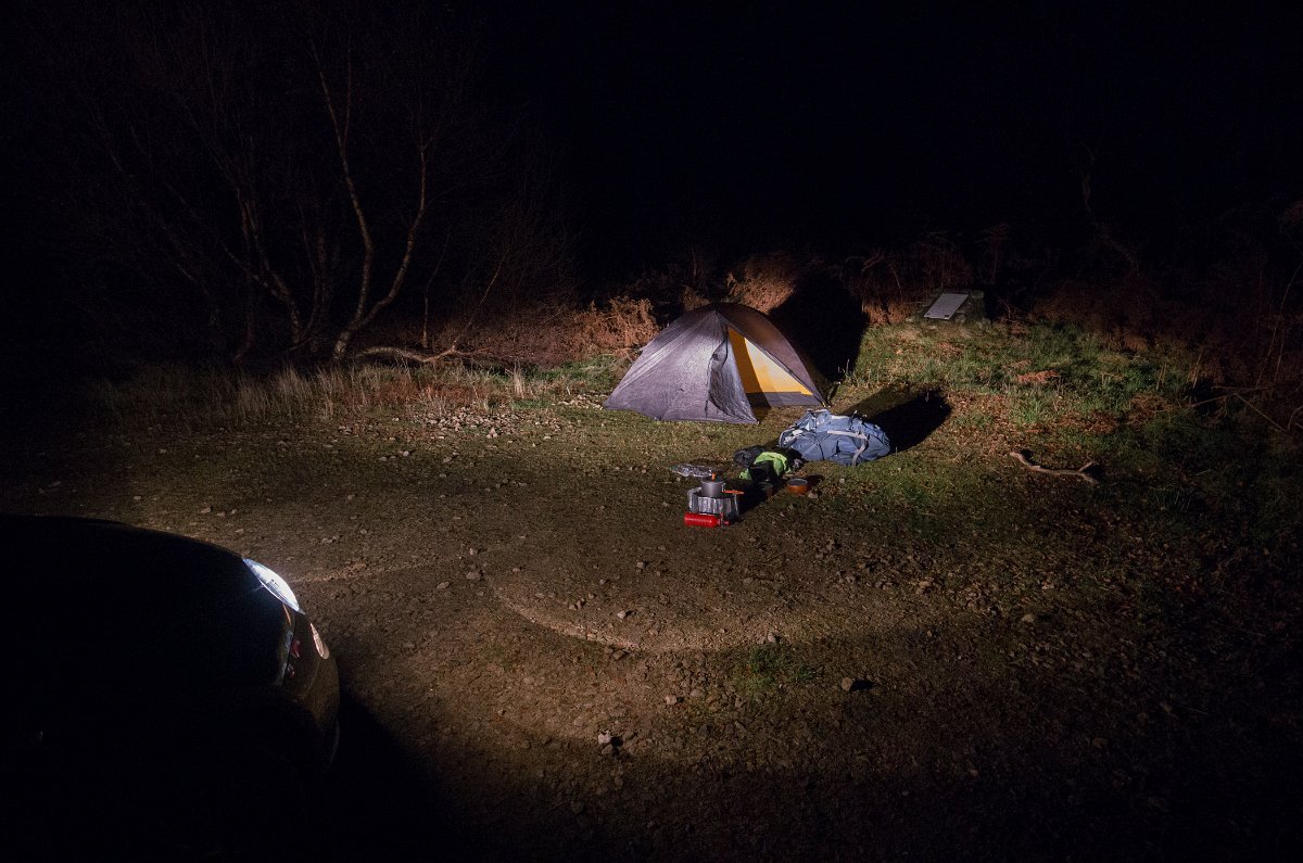 Tak v tomto sudu bude zrát single malt whisky Premium Single Bourbon Cask...mmm... A to bychom nebyli my, kdybychom arranskou whisky neokoštovali v putyce. Arran Single Malt je výborná ostrovní skotská whisky, která je pořádně "smoky" a "peety" . Veselého hodování však musíme zanechat a opustit vyhřátou hospodu do větru a zimy. Kousek od cesty se popásá stádo jelenů...tak si na ně posvítíme :) Stan stavíme na odpočívadle hned u cesty. Rozděláváme táborák a protože benzin ve vařiči došel, ohříváme masové konzervy na ohni. S rýží uvařenou před 3 dny v Aberdeenu, pivem a prázdnými žaludky je to výborná krmě.