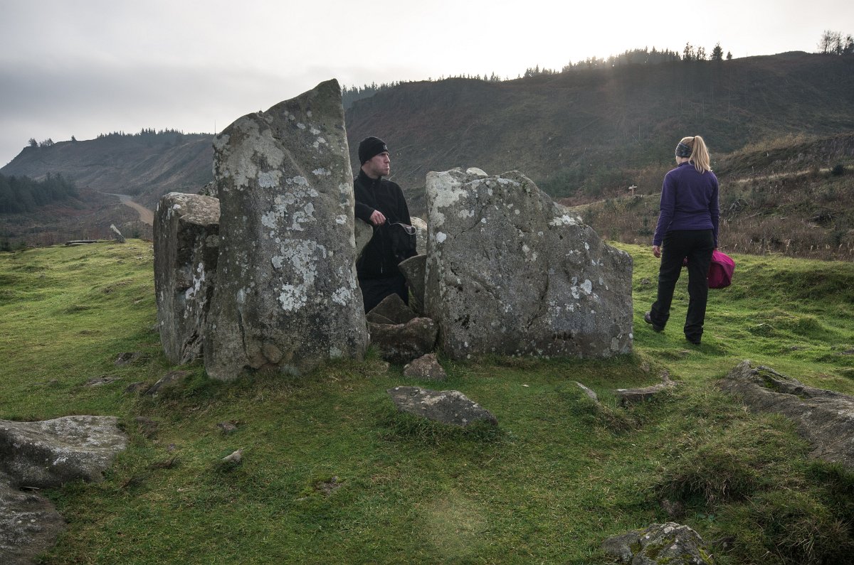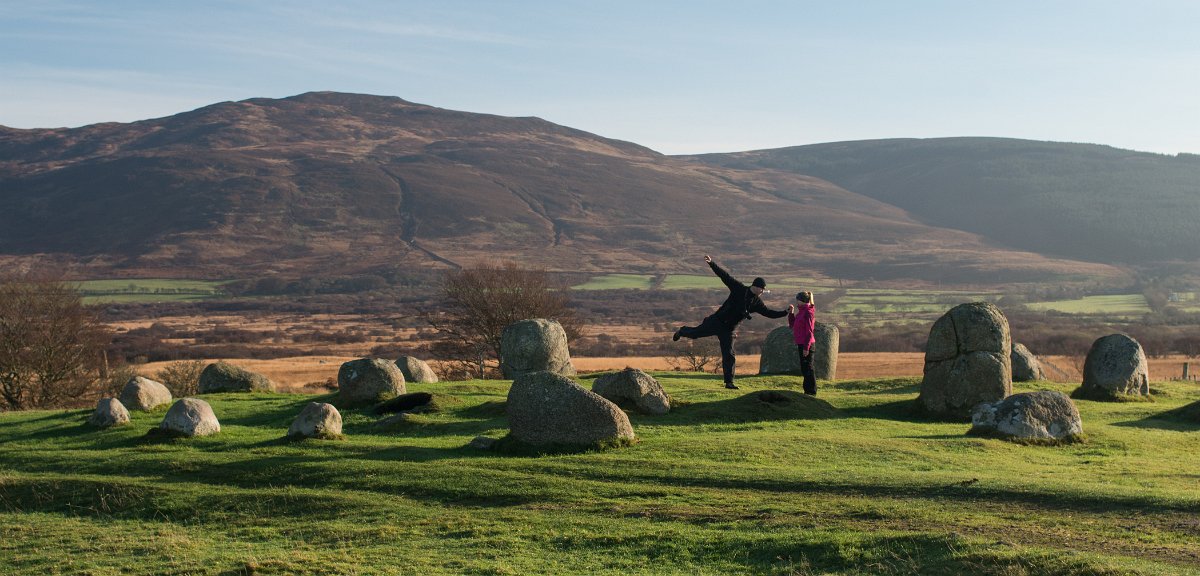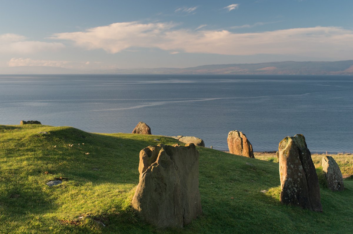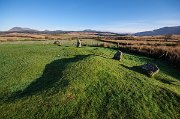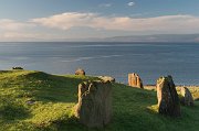Vyrážíme na vycházku k archeologickému nalezišti Machrie Moor. Snímek vhodně zachycuje oblíbené aktivity jednotlivých členů výpravy: Ondra kouřící, Andri smrkající a já fotící :) Západní pobřeží Arranu je přímo poseté kamennými kruhy a obelisky z doby kamenné a bronzové. Na 4 kilometrech trasy k nalezišti Machrie Moor potkáváme několik menších, ale zachovalých kamenných kruhů... ...a obelisků. 4000 let starý dvojitý kamenný kruh Fingal´s Cauldron napovídá, že jsme dorazili na Machrie Moor.