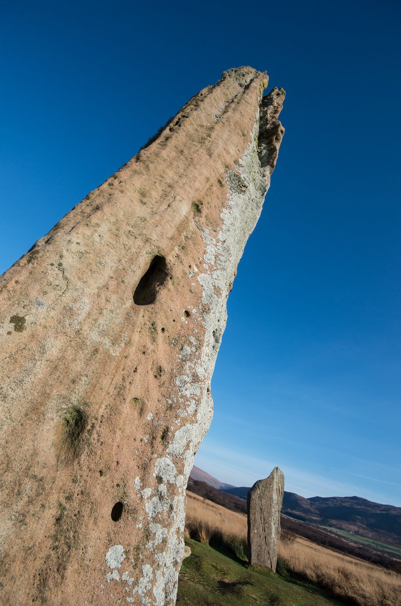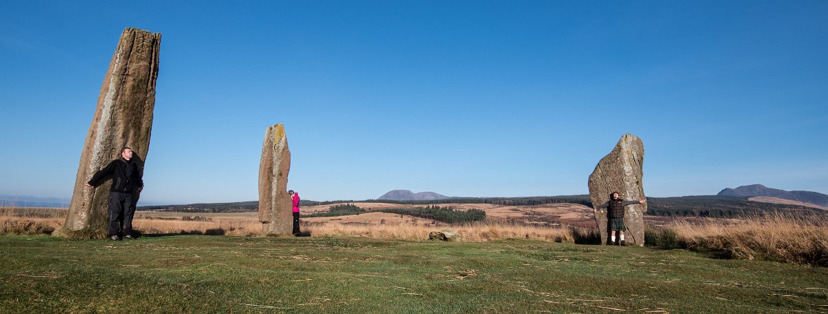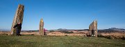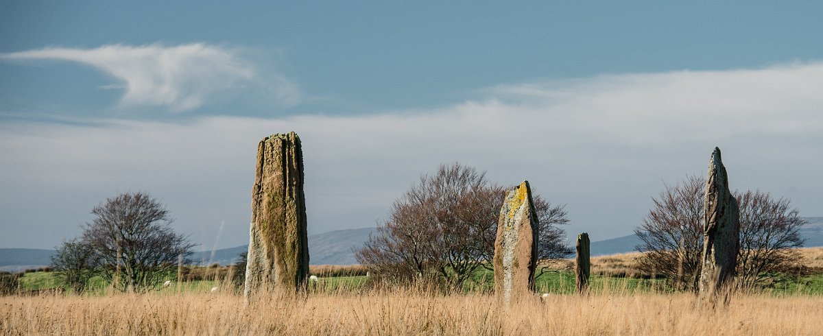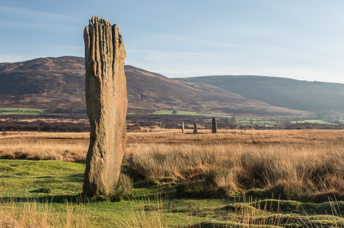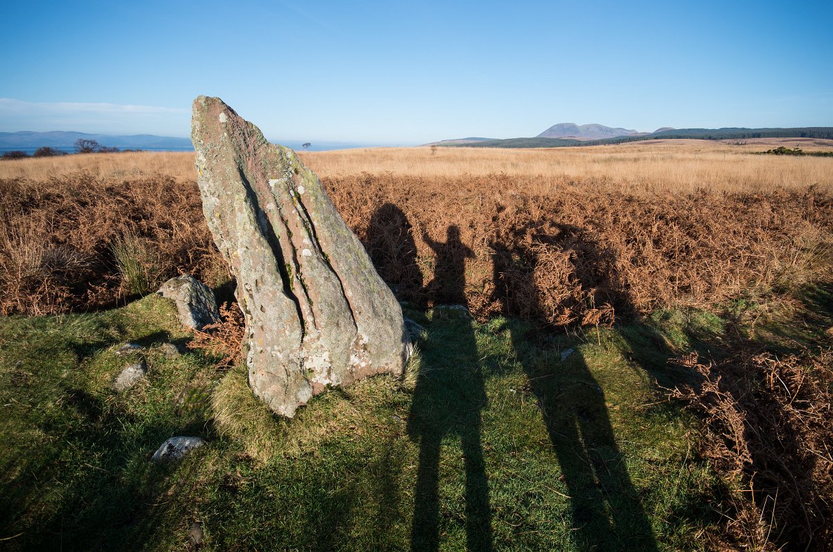 A to jsou ony! Nejslavnější monolity Machrie Mooru. První z nich stojí osamocený poblíž staré rozpadlé farmy Marchie Farm. 4 metrový monolit tak trochu připomíná lidskou ruku vztaženou k nebi. O kus dál v Machrie Moorském močálu najdeme další 3 velikány. Němí svědci dávných časů.