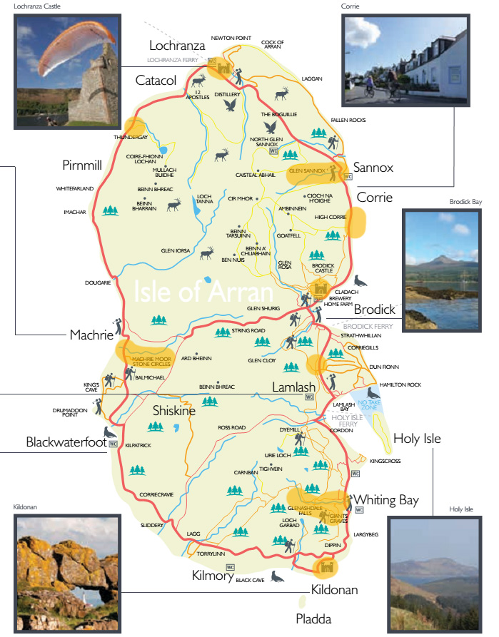 Mořskou stezkou opouštíme hlavní město Brodick, který má pouhých 700 obyvatel (celý ostrov Arran pak 4600). A protože jsme opravdu hladoví, výlet zakončujeme na trajektu zvěřinovým burgerem, mňam! A pak už jen hodinová cesta zpět do Glasgow a jsme zpět. Díky Andri&Ondro, bylo to s vámi skvělé! Jak jste sami viděli, je ostrov Arran, sedmý největší ostrov Skotska, tak trošku miniaturou celé skotské země. Za dva dny zde lze objevit hrady i pravěké stavby, jezera, hory, lesy, vřesoviště i nížiny, krásné pláže i vysoké vodopády a to vše na 430 km².