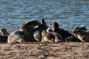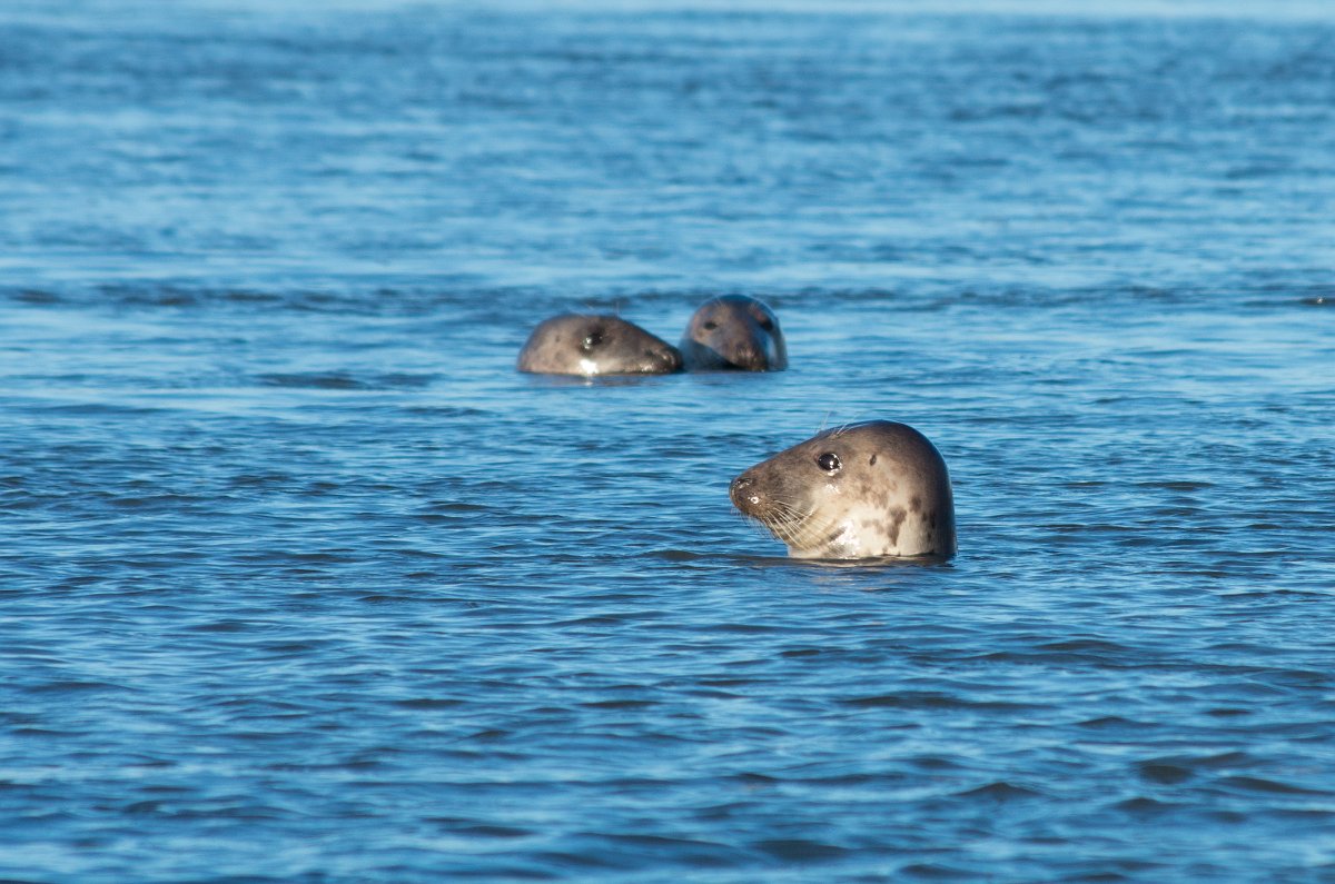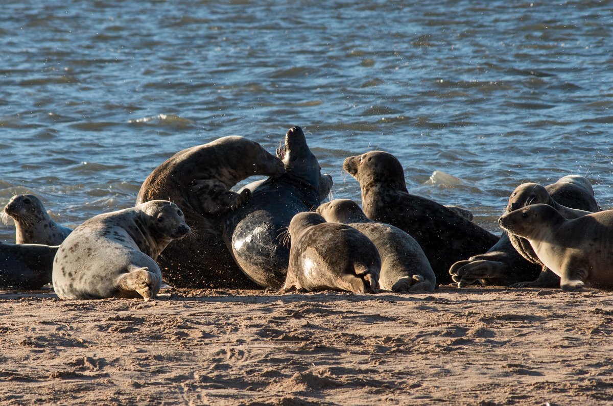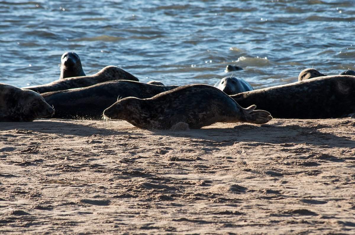 Dopolední vycházku si užívají i bahňáci čile pochodující po břehu. Hned za velkým hejnem ústřičníků si lebedí stohlavá kolonie tuleňů - asi největší turistické lákadlo ve Forvie. Tukem izolovaná zvířata nemají sebemenší problém s vodou o teplotě 4°C. Ve vodě jsou jako doma a tady, na rozhraní sladké říční a slané mořské vody mají dostatek potravy. Ach ta láska nebeská!