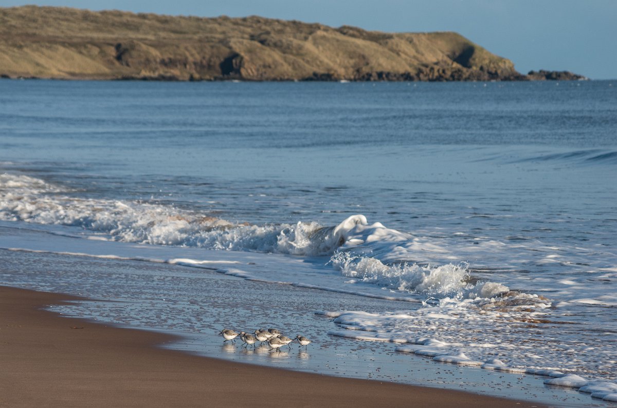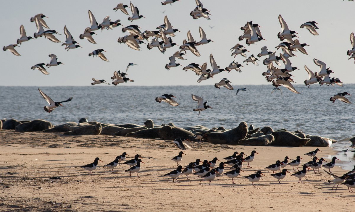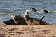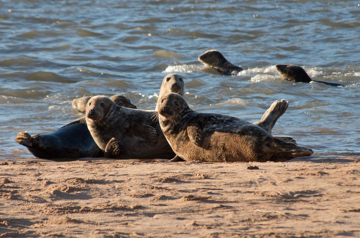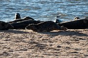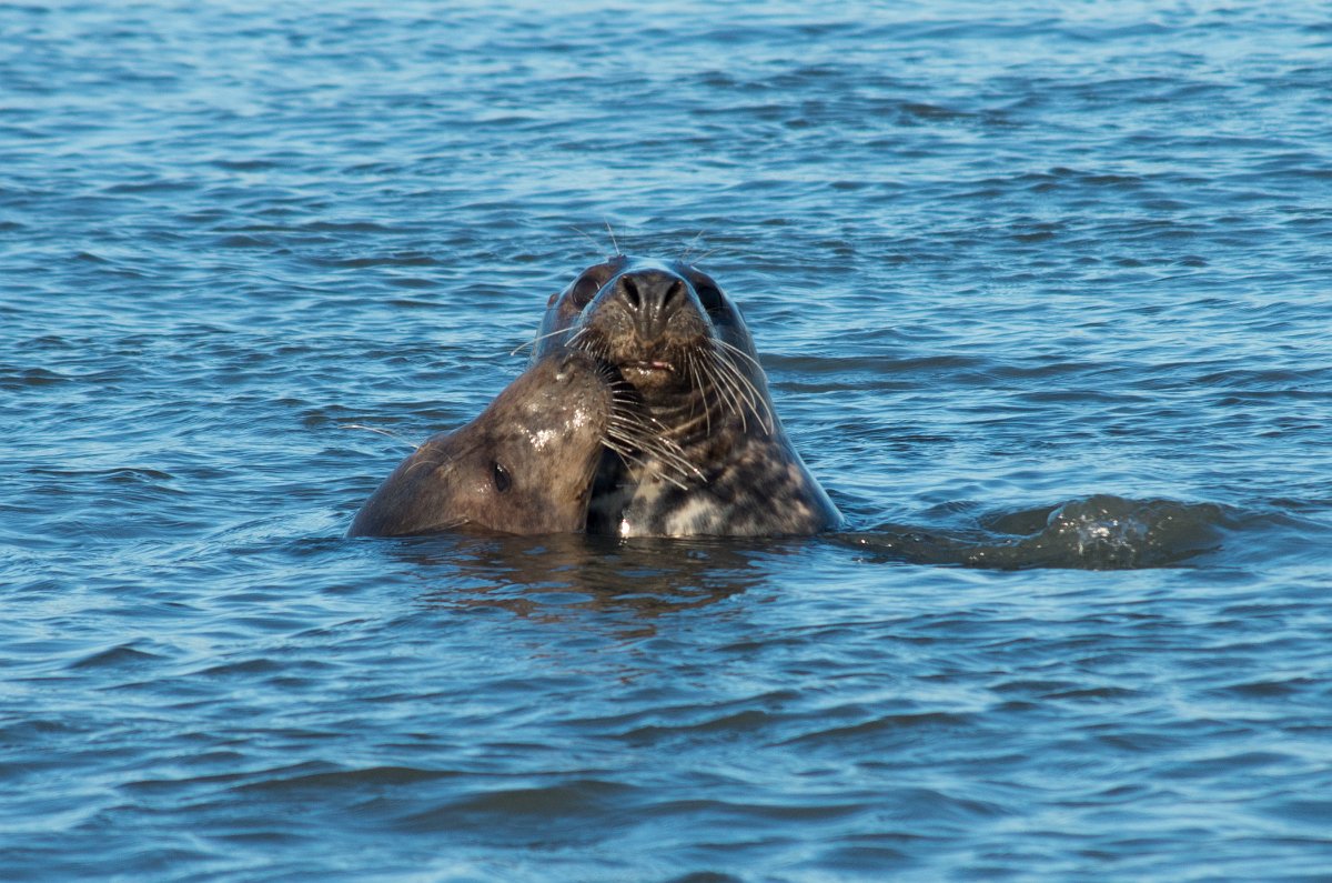 Dopolední vycházku si užívají i bahňáci čile pochodující po břehu. Hned za velkým hejnem ústřičníků si lebedí stohlavá kolonie tuleňů - asi největší turistické lákadlo ve Forvie. Tukem izolovaná zvířata nemají sebemenší problém s vodou o teplotě 4°C. Ve vodě jsou jako doma a tady, na rozhraní sladké říční a slané mořské vody mají dostatek potravy. Ach ta láska nebeská!