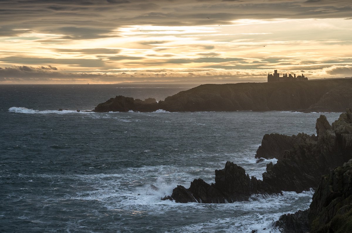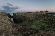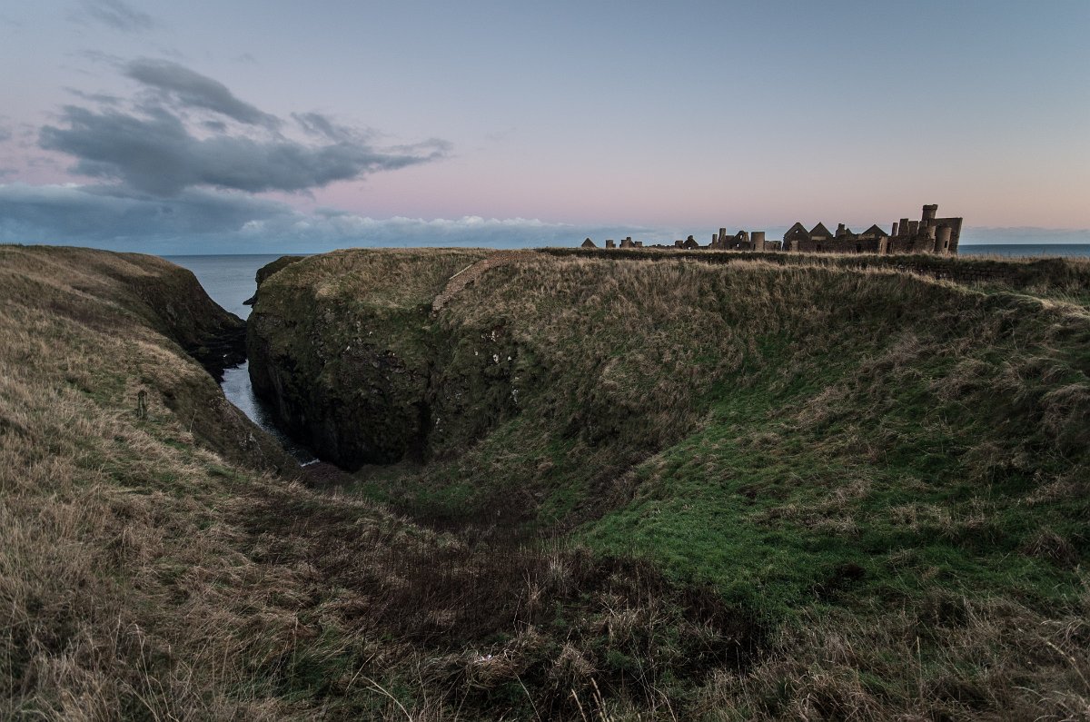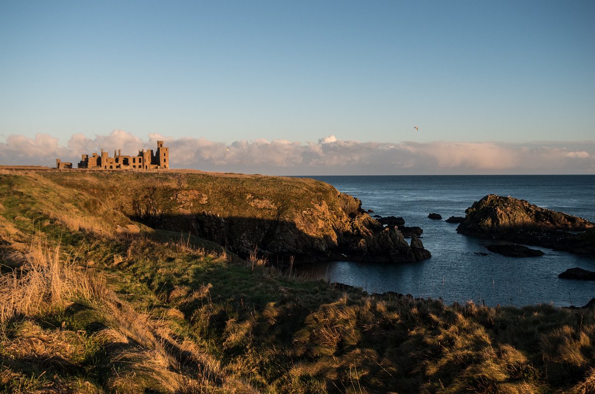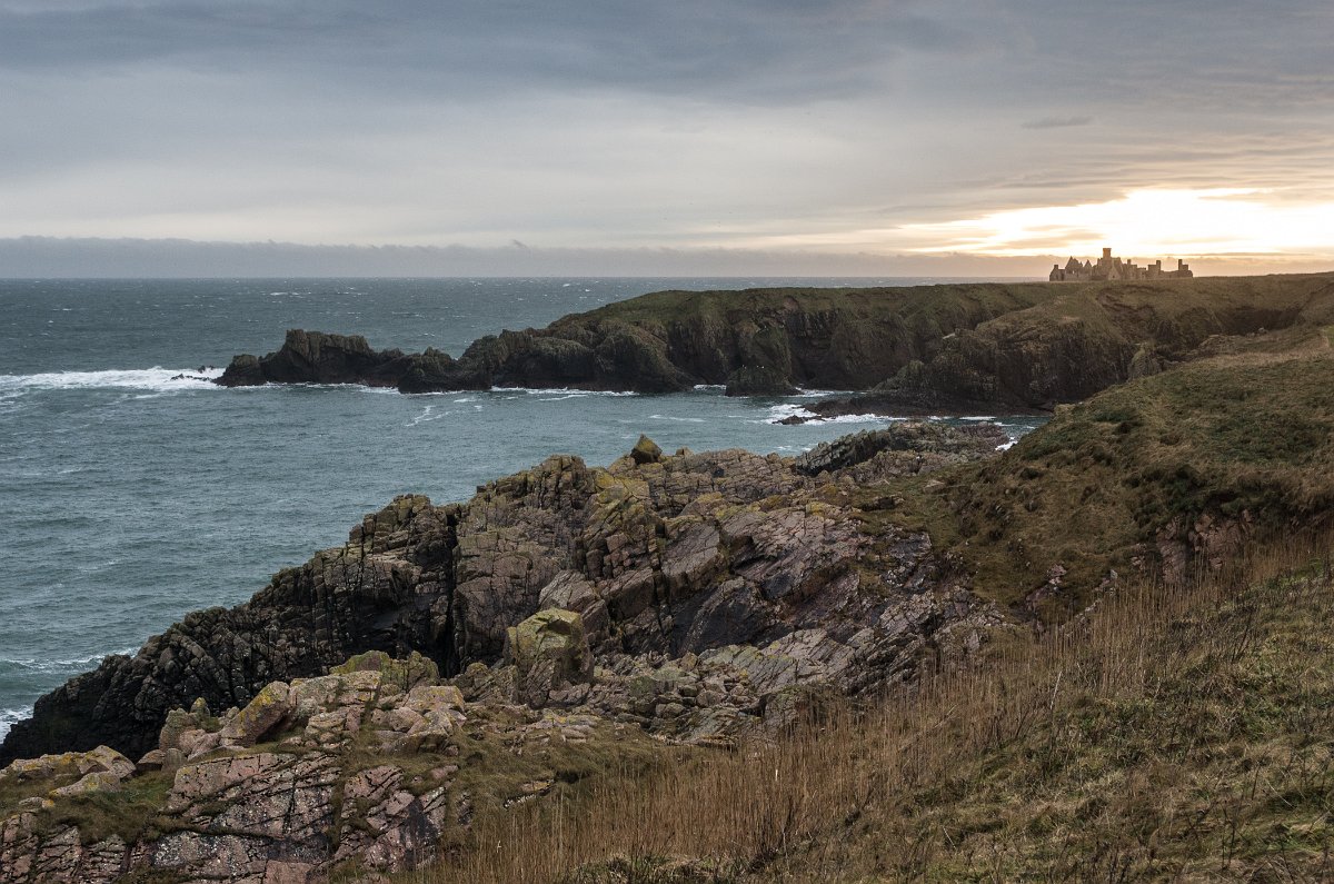 Postavený jistým šlechtickým rodem v 17. století na nehostinném větrném místě za podivných okolností. Budova s mnoha komnatami byla brzy opuštěna a začala záhy chátrat. Skála pod hradem stála život mnoha lidí a doslechli jsme se, že i na samotném hradě snad byly spáchány nějaké vraždy. V nehostinné krajině kolem hradu jsou roztroušeny ještě další pevnůstky. (6.12.2014) Noc na hradu či na nehostinných větrných pláních nás však nelákala a tak jsme stan postavili v lesíku poblíž vesnice Cruden Bay a spalo se nám báječně. Druhý den pokračujeme v naší cestě po pobřeží k severu. Slains Castle z dálky působí snad ještě mohutněji a zlověstněji, než zblízka.