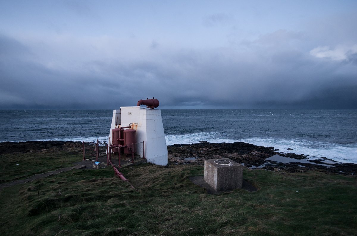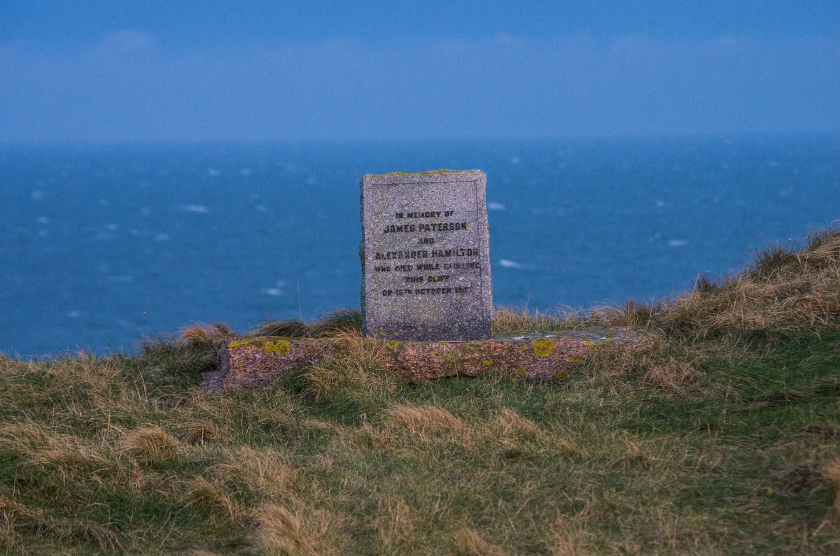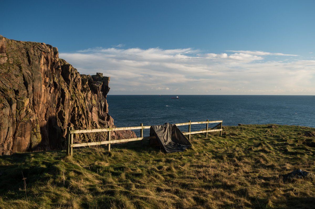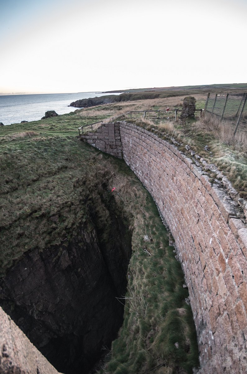 Od Skotské Vysočiny vane silný vítr a Severní moře se střemlavě vrhá na ošlehané útesy Bullers of Buchan. Pomníček připomíná, že není radno zacházet na okraje útesů. Asi neslavnější skalní útvar Bullers of Buchan je mohutná skalní brána vysunutá do moře. Přicházíme k vesnici Coldwells, kde útesy Bullers of Buchan přecházejí na Bullers of Boddam. HUS 8862