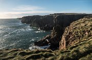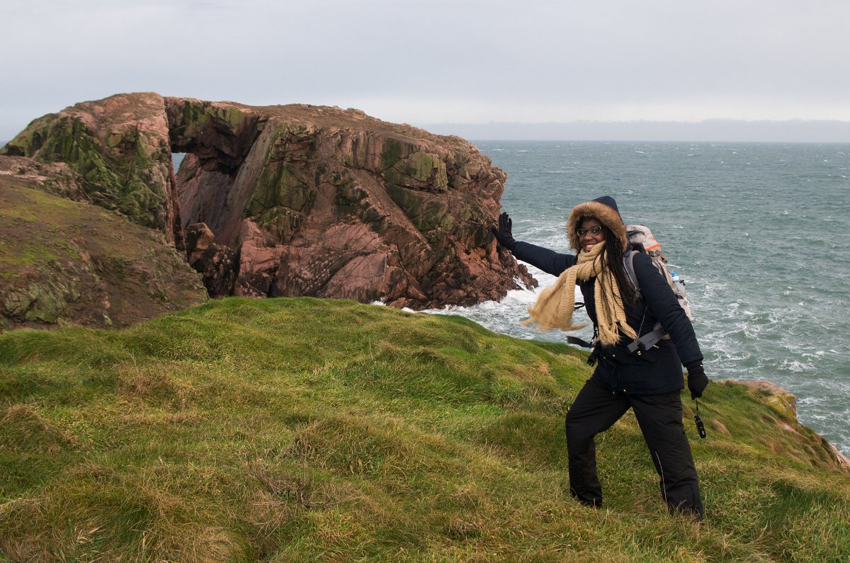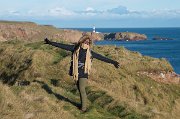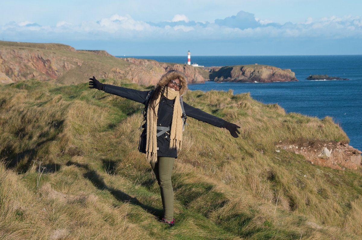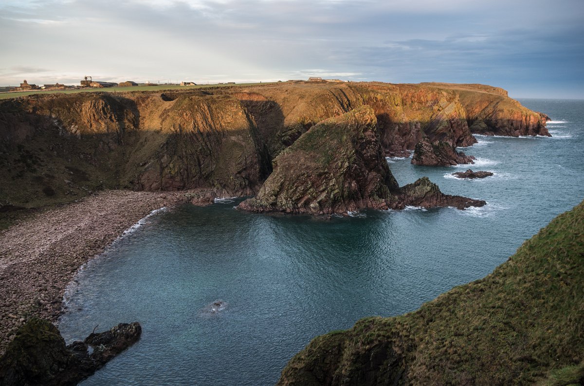 Od Skotské Vysočiny vane silný vítr a Severní moře se střemlavě vrhá na ošlehané útesy Bullers of Buchan. Pomníček připomíná, že není radno zacházet na okraje útesů. Asi neslavnější skalní útvar Bullers of Buchan je mohutná skalní brána vysunutá do moře. Přicházíme k vesnici Coldwells, kde útesy Bullers of Buchan přecházejí na Bullers of Boddam. HUS 8862