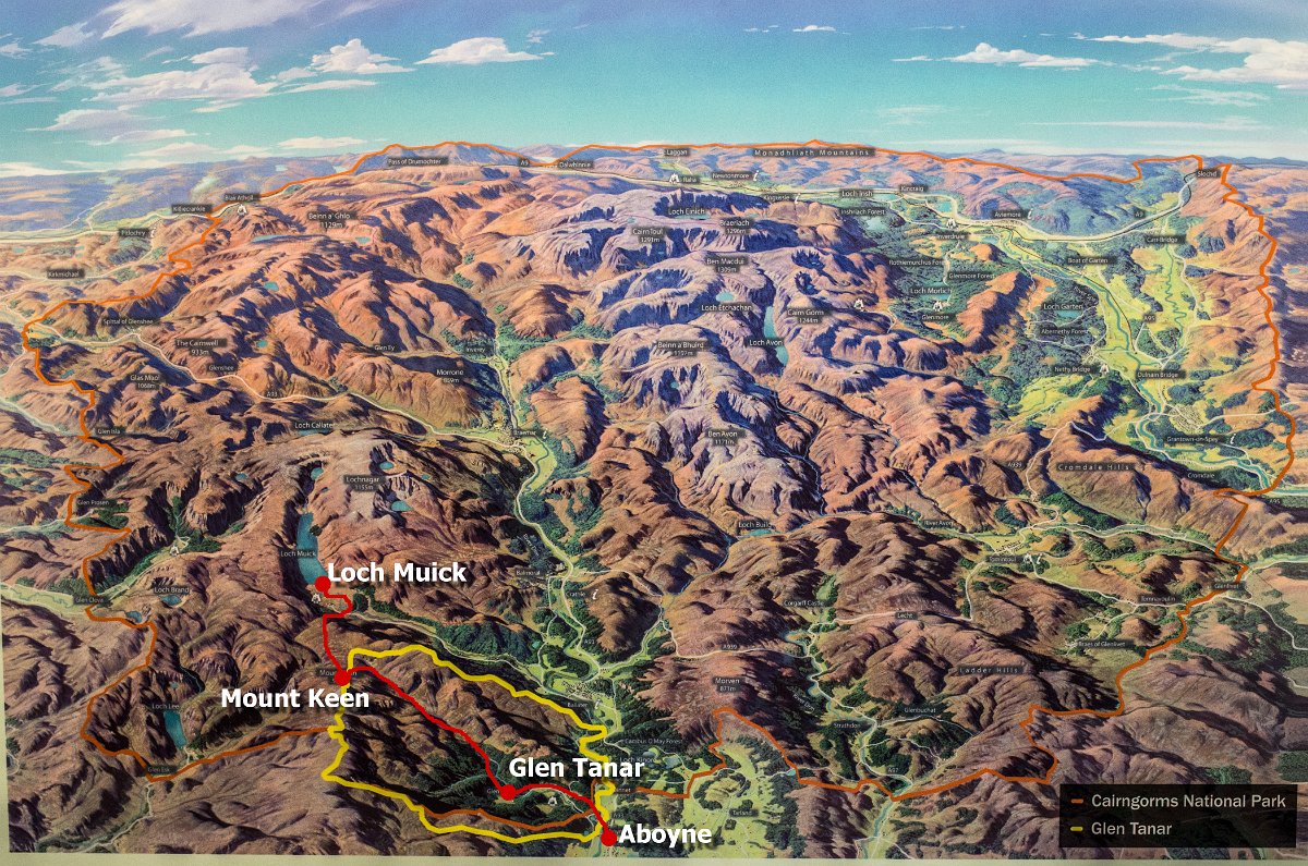 1 (27.9.2014) Počasí na tento víkend nemá být přímo ukázkové, ale přesto se vydávám do hor 40km od Aberdeenu - do národního parku Cairngorms, kde chci podniknout 35km dlouhou túru z městečka Aboyne k jezeru Loch Muick. Má trasa je zaznačena červenou linkou.