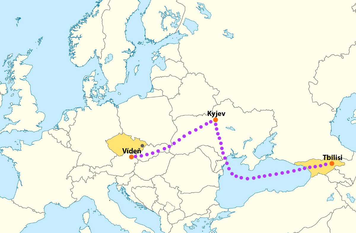 7 ...ale my pokračujeme v letu nad zamračenou Evropou, abychom po necelých třech hodinách letu přistáli ve Tbilisi, hlavním městě Gruzie.