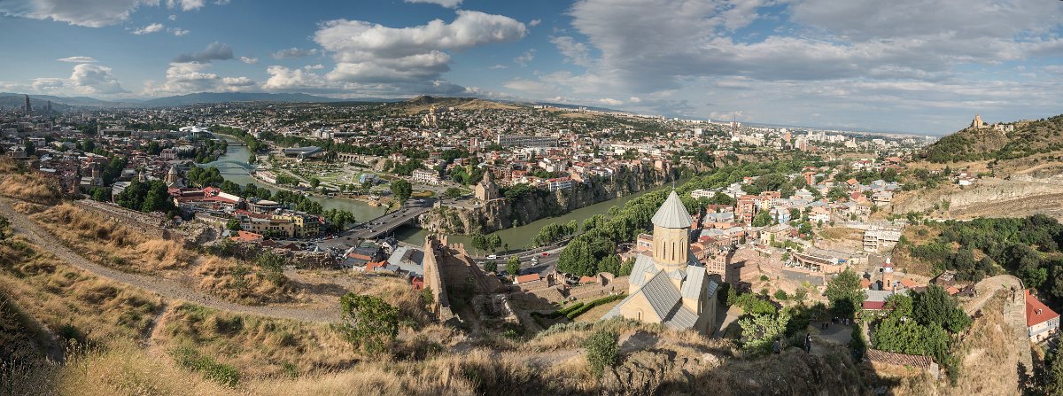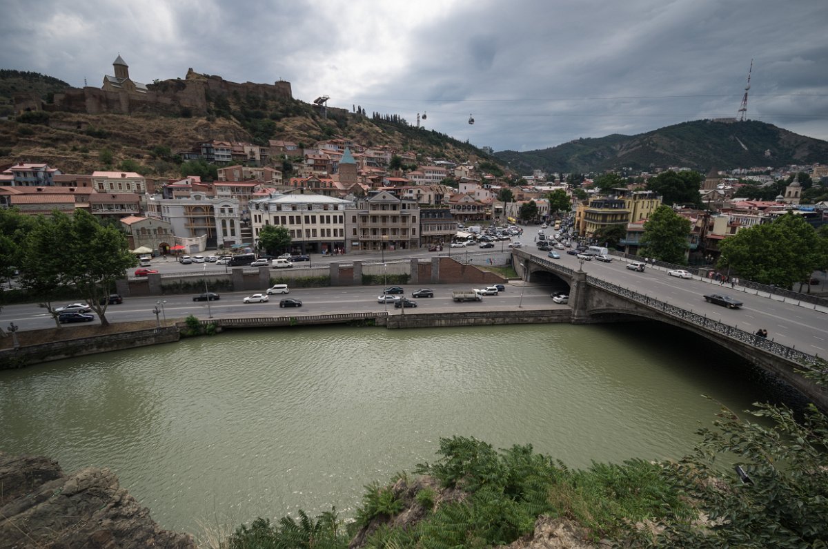 10 Ale pojďme se nyní podívat do ulic Tbilisi. Město leží na řece Kura, kterou lemují poměrně vysoké kopce. Z jednoho shlíží hrad Narikala, z druhého 300 m vysoká televizní věž.