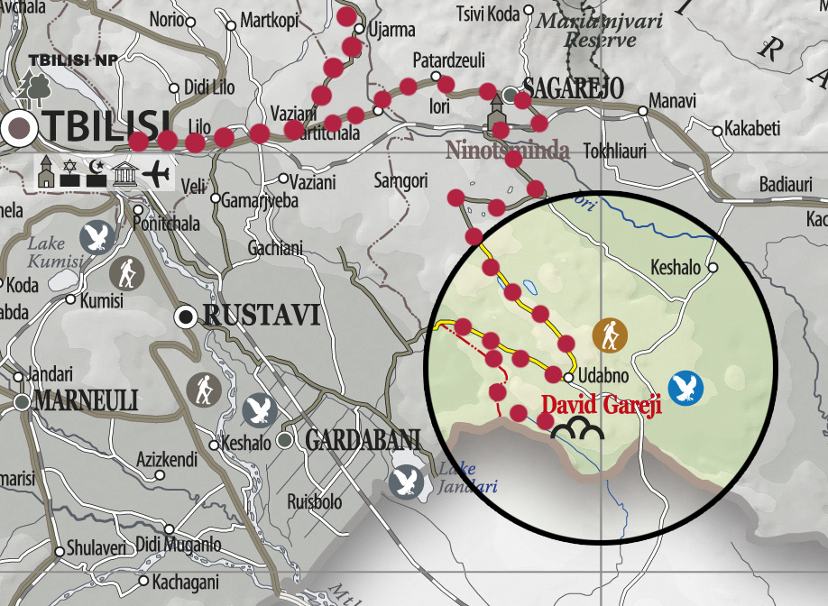 13Tourism_MAP_Page1 Z Pankisi se vracíme zpět do Tbilisi. Spolu s Pavlínou a Zurou, přítelem od Ines, podnikáme poslední výpravu do 70 km vzdáleného klášterního komplexu David Gareji na hranici s Azerbajdžánem.