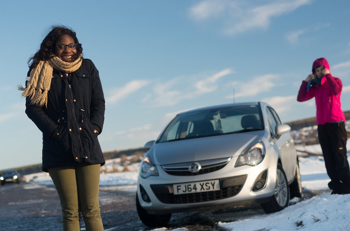 1 (17.1.2015) Sice je kosa jak z nosa, ale hurá na výlet! Caroline, Andri, já a stříbrný Vauxhall Astra.