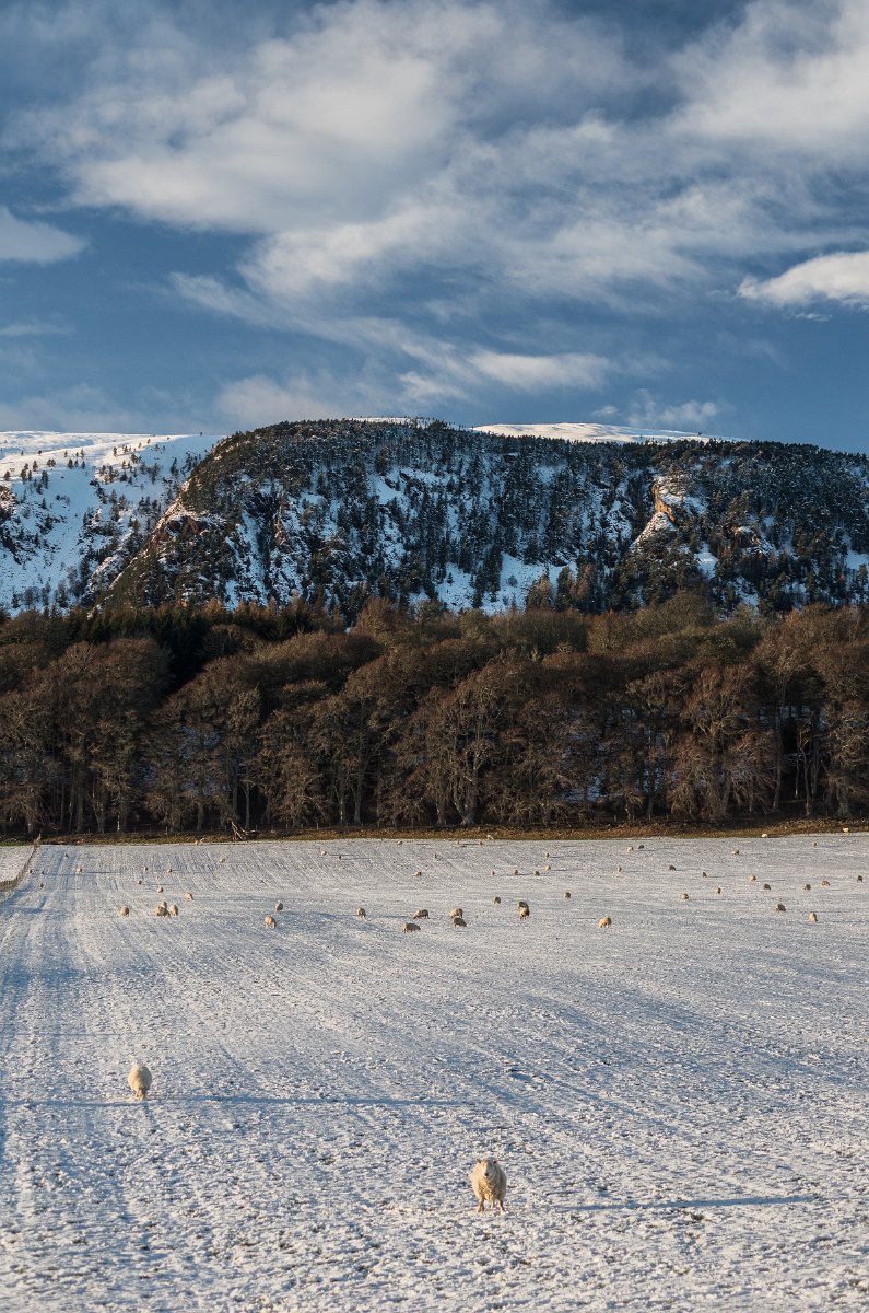 6 Z Inverness se vydáváme na jih, kde se na zasněžených pastvinách pod blankytnou oblohou pasou (?) ovce.