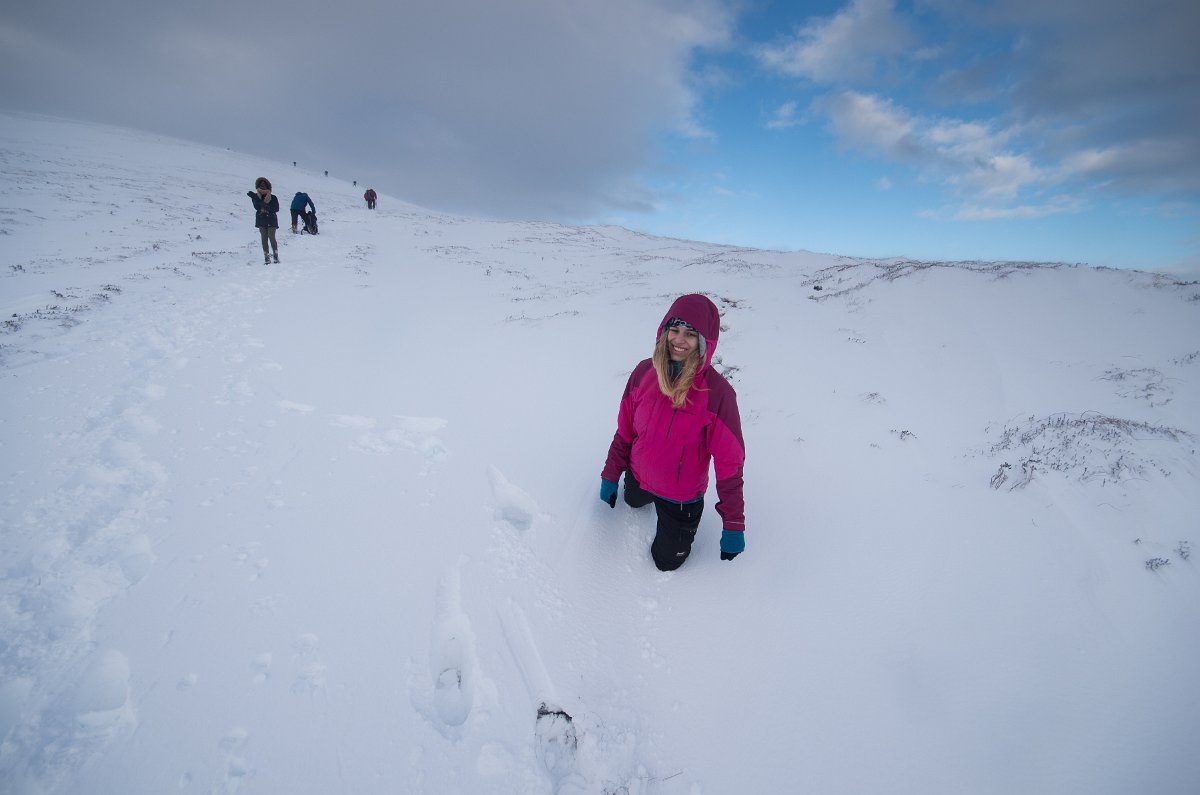 34 Na zpáteční cestě se boříme opravdu solidně. Mně se dokonce podařilo probořit do jezera skrytého pod sněhem, naštěstí to odnesly jen mokré pohorky.