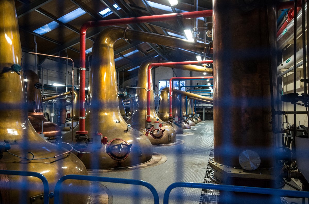 42 Nahlédneme do výrobní haly, kde se v desítkách destilačních přístrojů připravuje lahodný nápoj...mmmm...