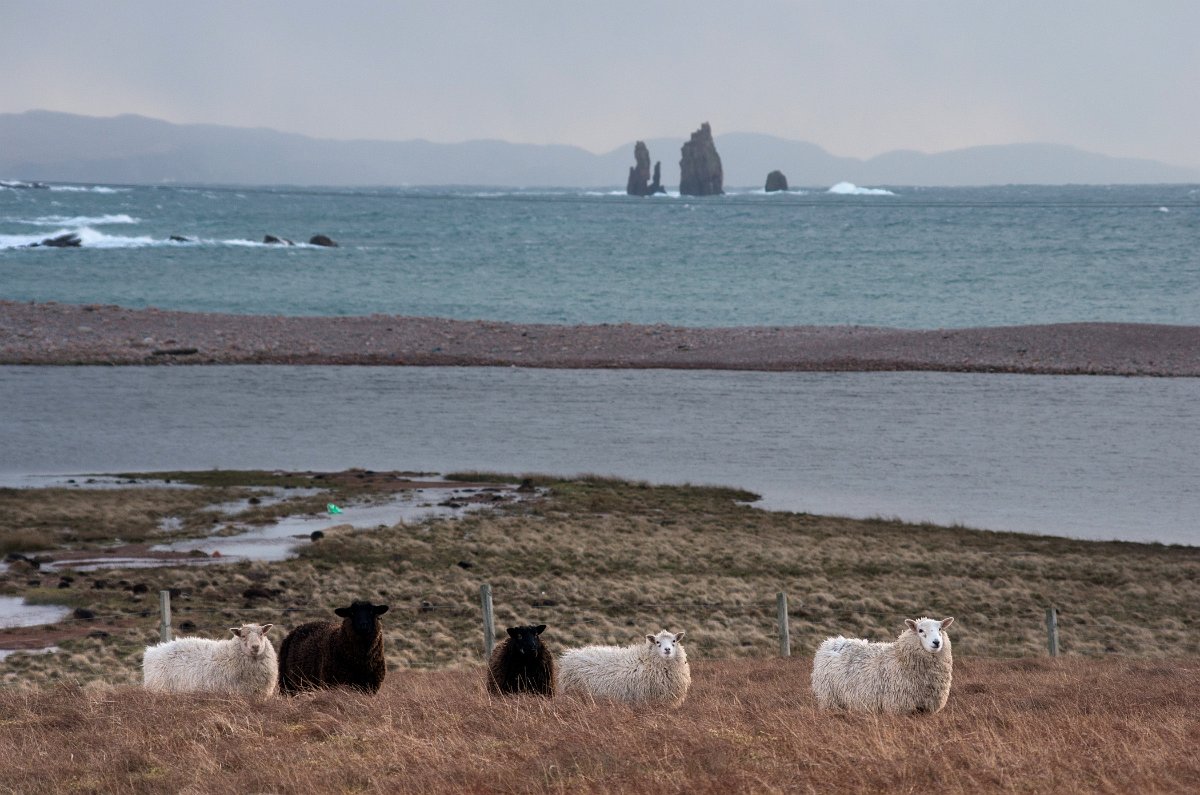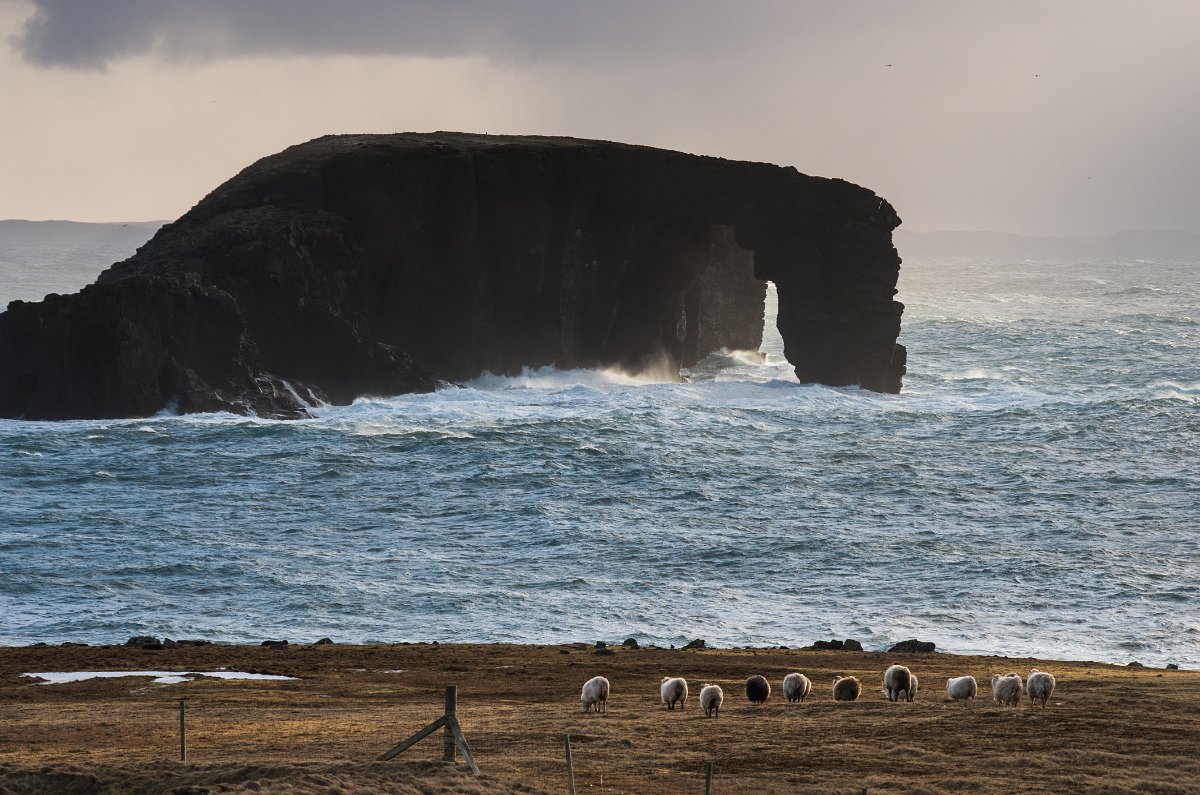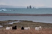 32 Stádo ovcí a skála Dore Holm připomínající pijícího koně.