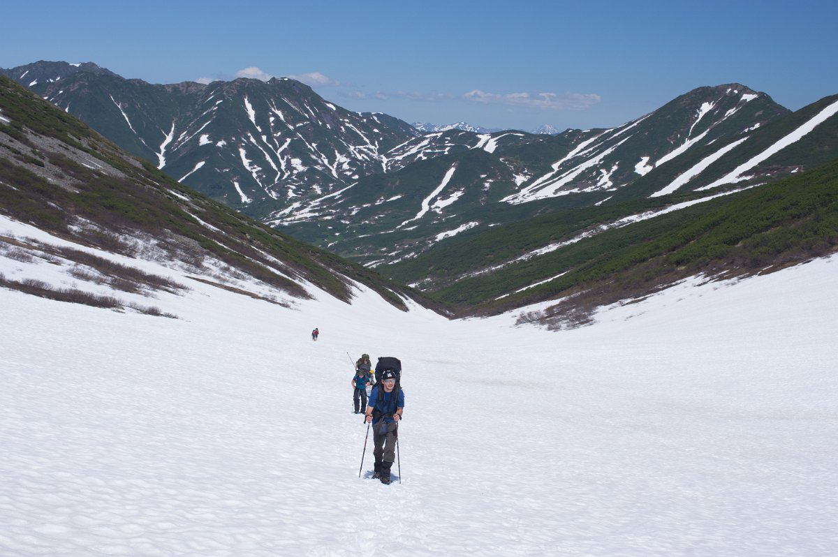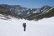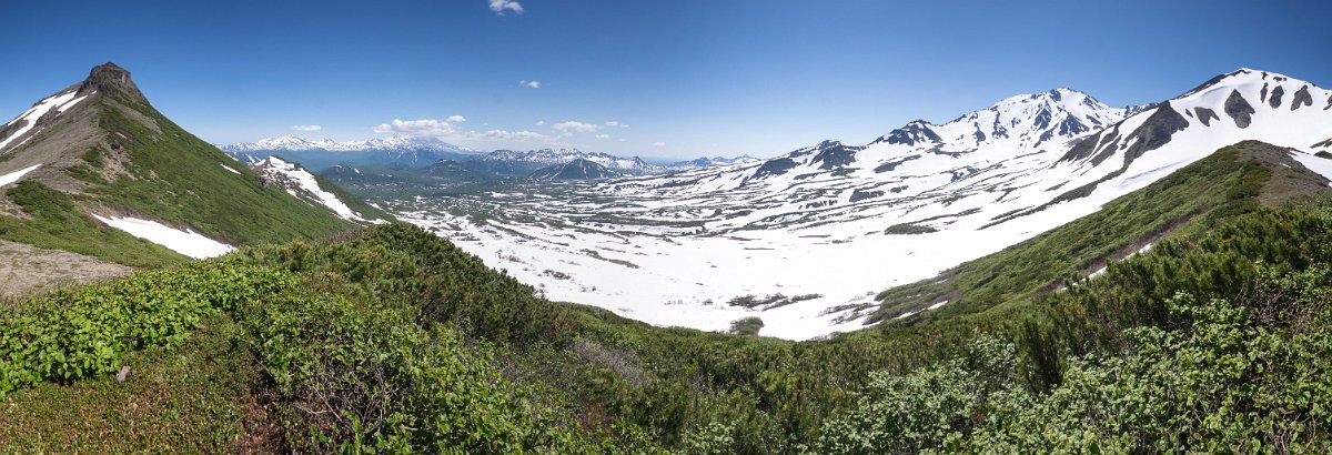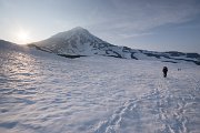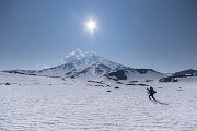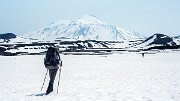 15 Za chvíli sjíždíme po sněhových polích do doliny, ze které se na druhé straně tyčí sopka Dženžur (2285 m) a Županovský vulkán (2958 m).
