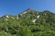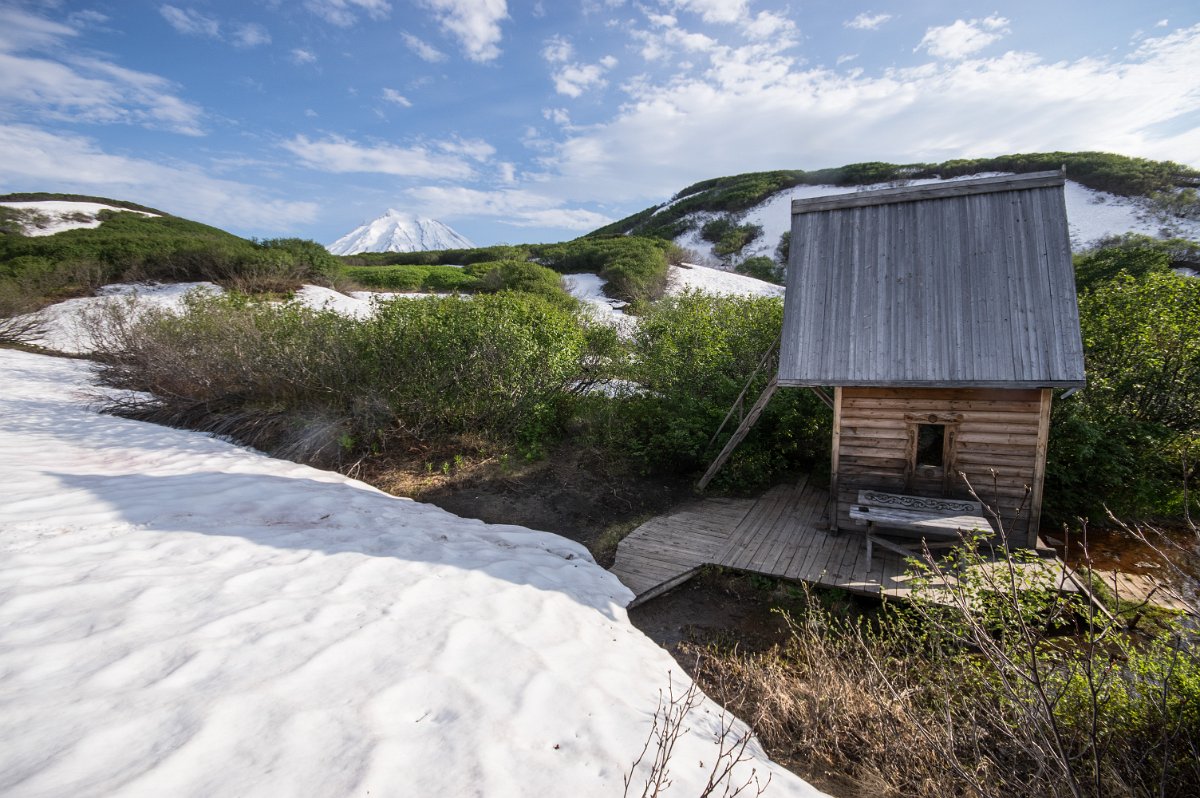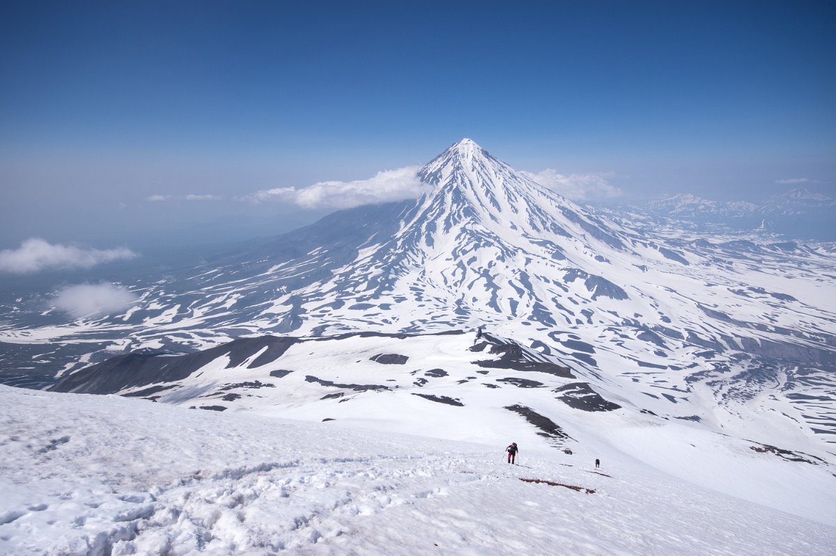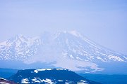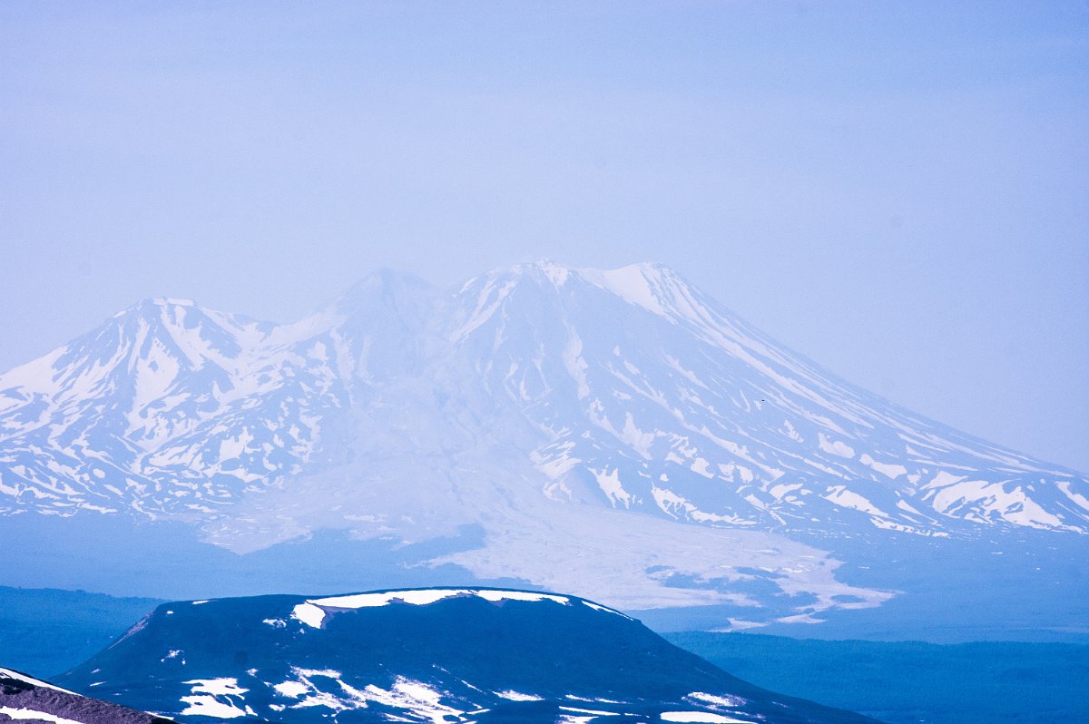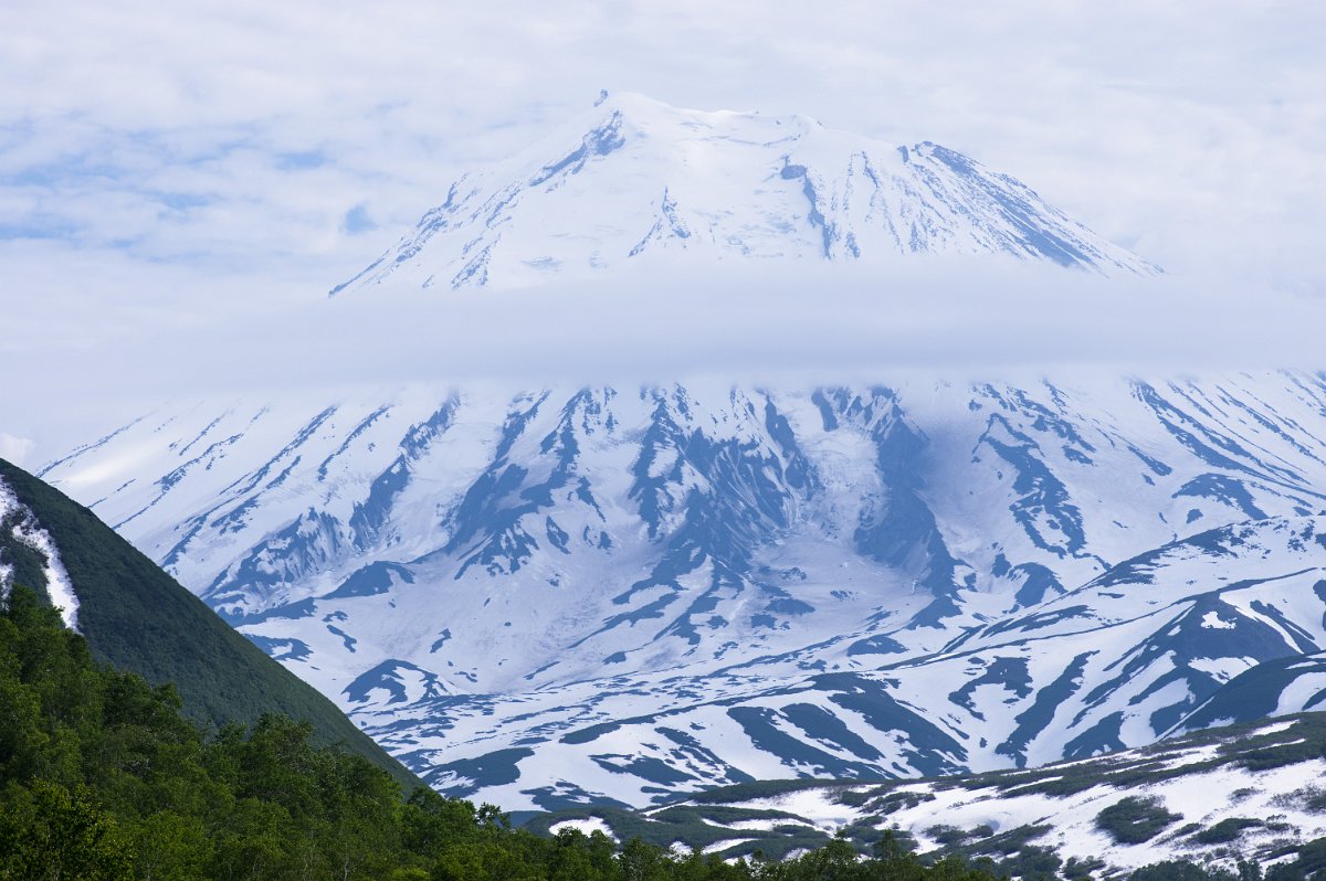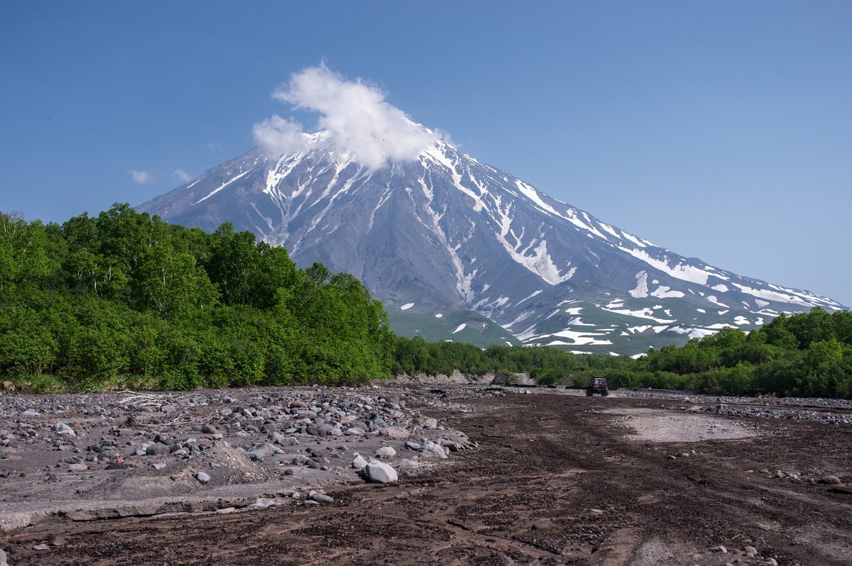 38 Korjacká sopka (3456 m n. m.) se nám zase přibližuje a my můžeme obdivovat ledovcové splazy na jejích severních úbočích. Tento stratovulkán je málo aktivní. Jeho jedinou současnou aktivitou jsou fumaroly nacházející se v prasklinách ze severní strany, blíže k vrcholu. Severní část vrcholu tvoří pozůstatky starobylého kráteru o průměru 500 m který je vyplněn ledovcem. Vulkán se chová klidně, poslední jeho mírně zvýšená aktivita byla v roce 2009.