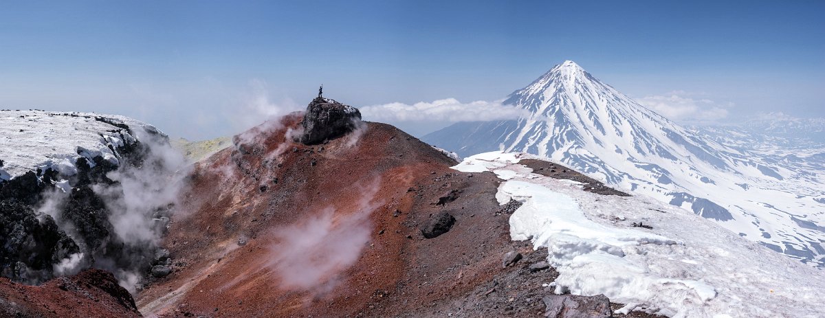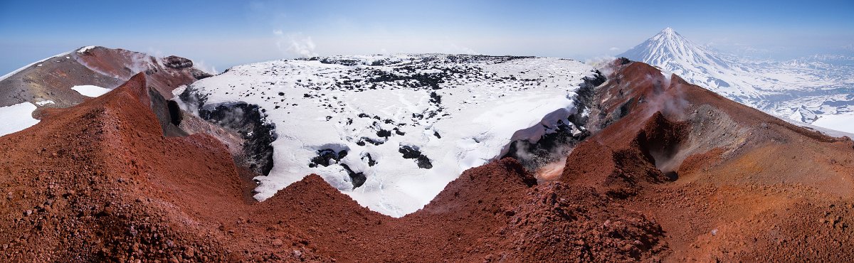 58 Z vrcholu se nám odkrývá impozantní pohled do téměř 400 m širokého kráteru. Původní vulkán vznikl desítky tisíc let nazpět, v té době byl vyšší jak v.Korjacký. V těchto dávných dobách byla aktivita provázená velmi silnými erupcemi při kterých došlo k úplnému zničení velké časti jeho masívu kužele. Vznikla kaldera o průměru asi 4 km. Okolo pěti tisíc let nazpět se postupnými novými erupcemi začal z kaldery postupně vytvářet nový kužel, který zde stojí dodnes.