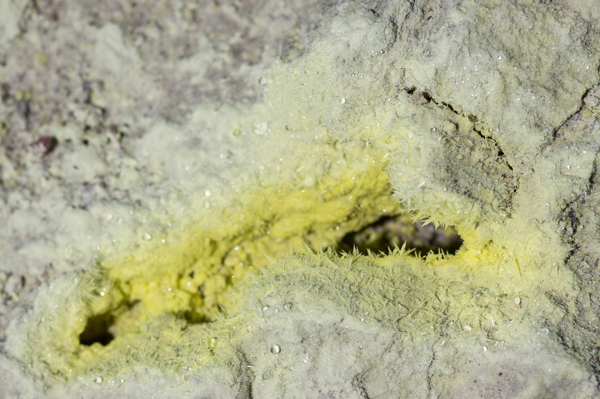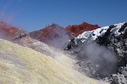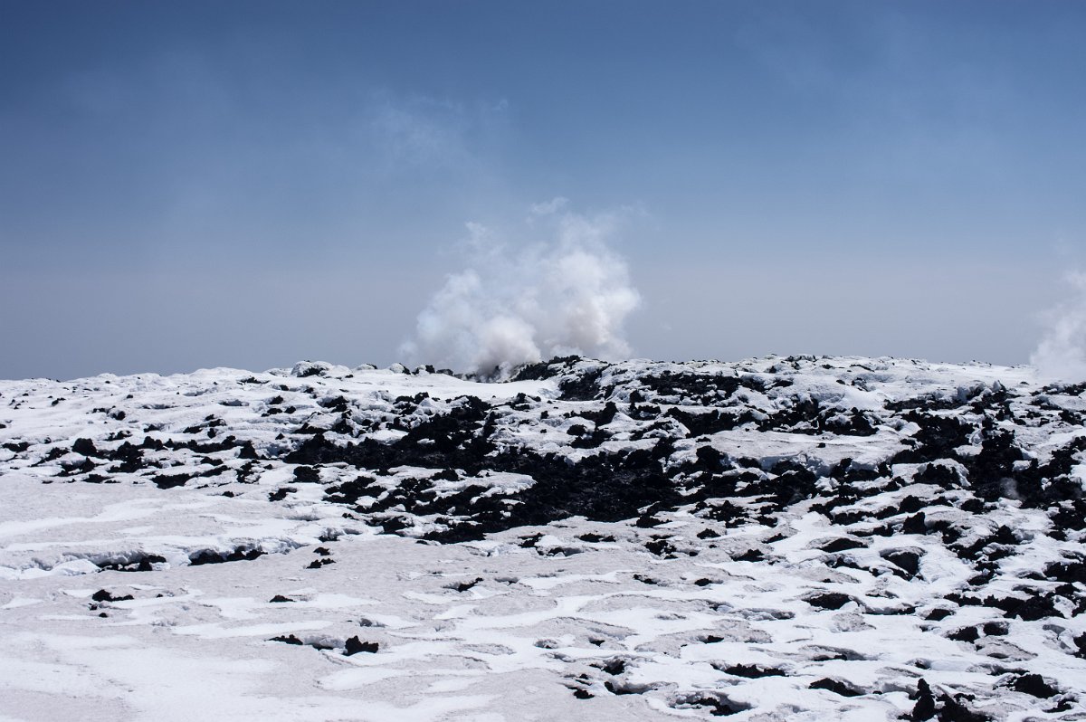 56 Černá a červená lávová pole ostře kontrastují s kanárkově žlutými sirnými poli, bílým sněhem a blankytnou oblohou.