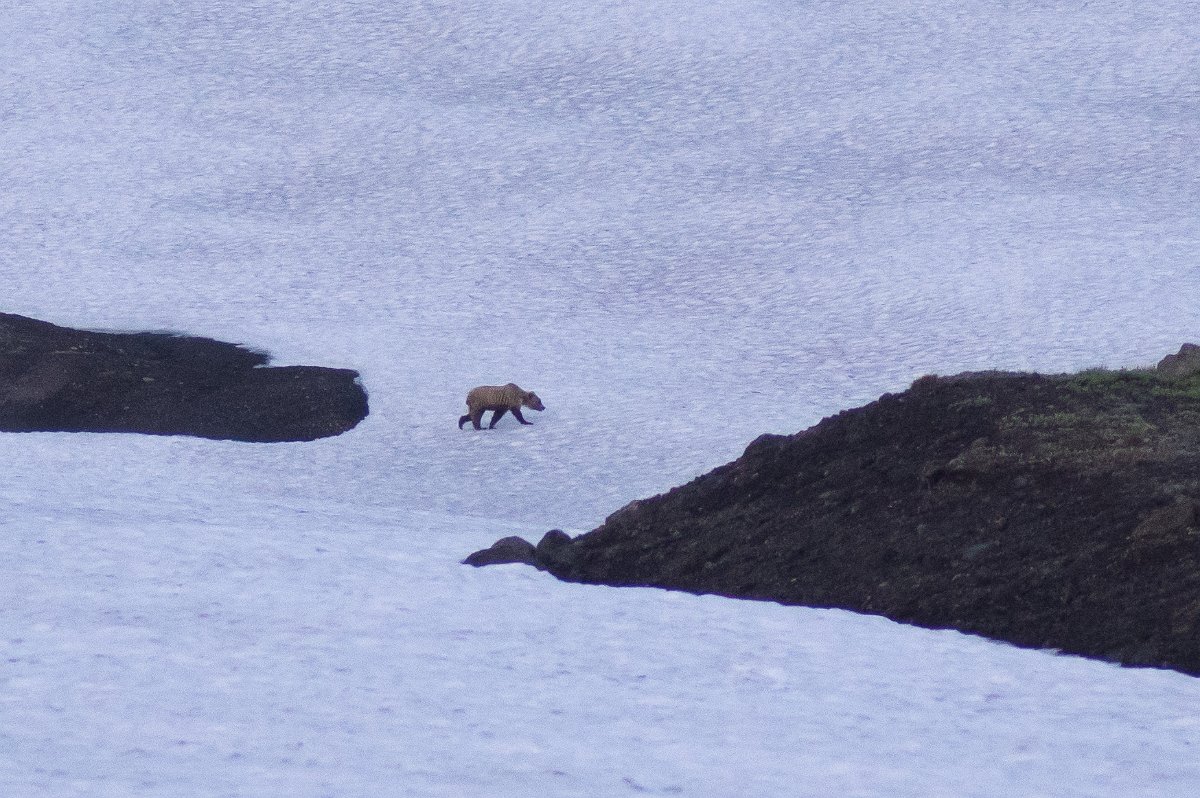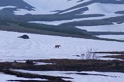67 MEDVĚD! Asi 400 metrů od nás z houští si to vyšlapuje huňáč. Štráduje si to tundrou dosti obezřetně - co kdyby ho ti lidé u stanů chtěli zastřelit?