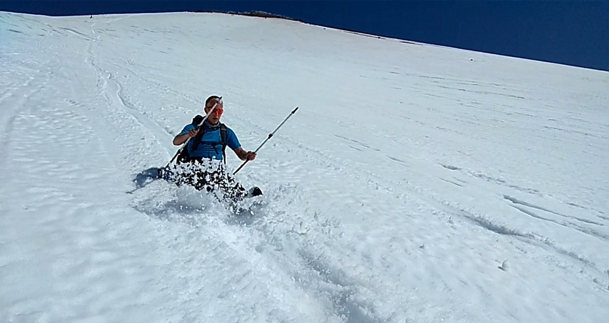 63 A jak jinak než po zadku. Nahoru jsme lezli 3 hodiny, dole jsme byli ani ne za hoďku. Má nejvyšší naměřená rychlost pohybu - 43 km/h. U stanu stačilo jen vyměnit mokré kalhoty a pokračujeme dál.