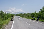 70 Asfaltka = Civilizace. Jdeme stopovat! Do Petropavlovsku je to odtud ještě 15 km, ale hned druhé auto nám zastavuje a milá paní nás přesouvá zpět k Fimovi.